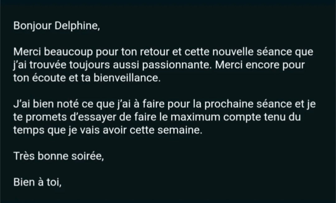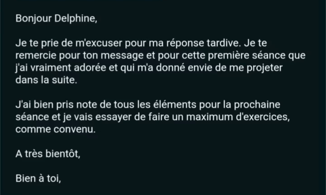 Comptez environ 1h à 2h de travail personnel par semaine (lecture, exercices, écriture) entre nos rendez-vous.